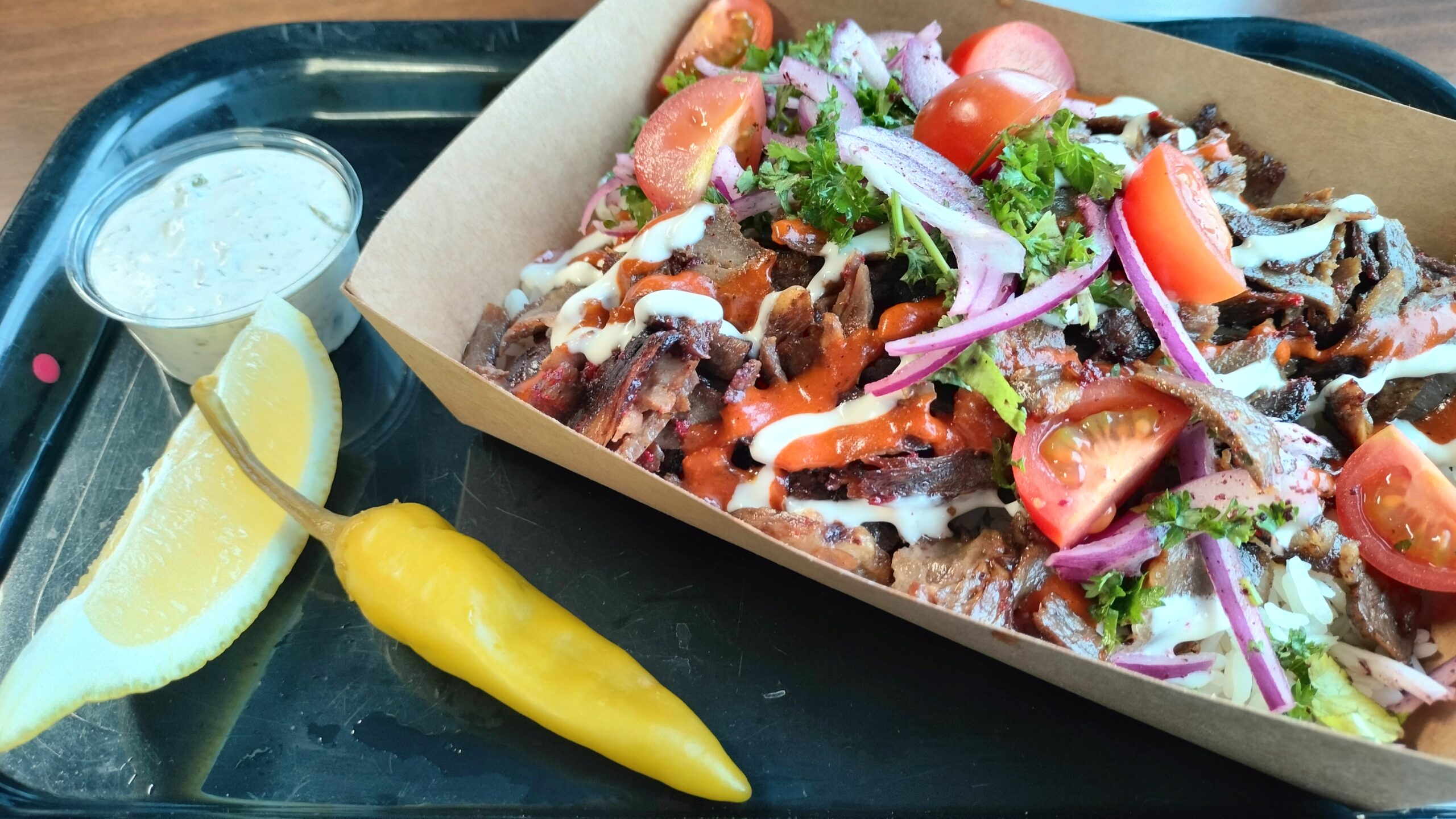 Aidoissa DÖNER -vartaassa grillattua ja omalla mauseseoksella maustettua lihaa valintasi mukaan, kirsikkatomaatteja, marinoitua punasipulia, yrttejä, mietoa jalapenoa ja kebab- ja valkosipulikastiketta. Tarjoillaan tzatzikin ja sitruunalohkon kanssa. Valitse riisillä tai ranskalaisilla.