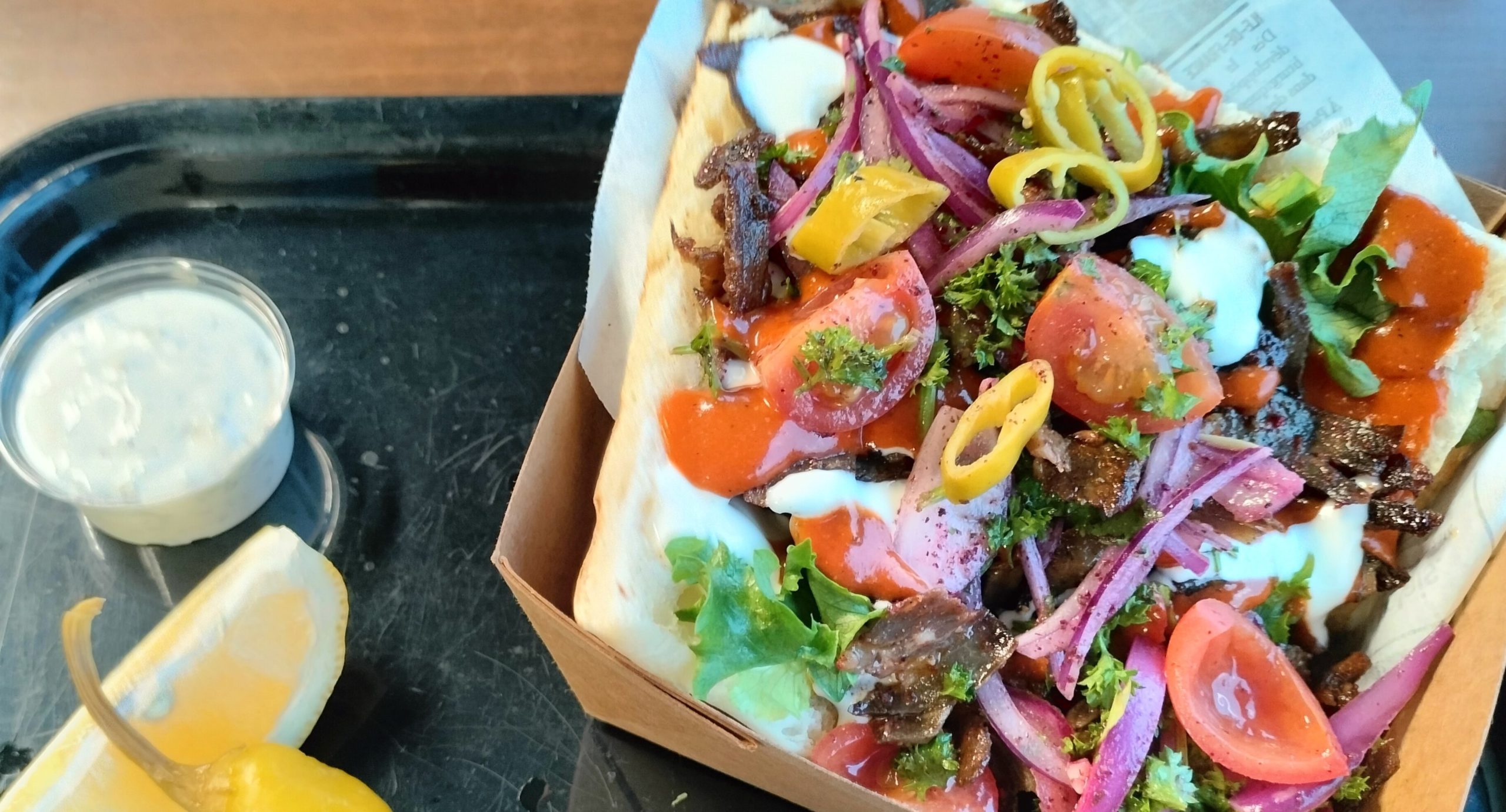 Kaikki annokset sisältävät raikasta salaattia, kirsikkatomaatteja, yrttejä, marinoitua punasipulia, mietoa jalapenoa, kebab- ja valkosipulikastiketta. Tarjoillaan tzatzikin ja sitruunalohkon kanssa.